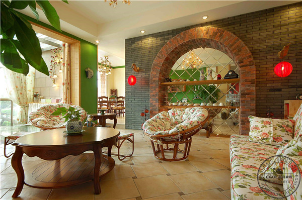 歐式田園風(fēng)格,設(shè)計上講求心靈的自然回歸感,給人一種撲面而來的濃郁氣息。把一些精細(xì)的后期配飾融入設(shè)計風(fēng)格之中,充分體現(xiàn)設(shè)計師和業(yè)主所追求的一種安逸、舒適的生活氛圍。這個客廳大量使用碎花圖案的各種布藝和掛飾,歐式家具華麗的輪廓與精美的吊燈相得益彰。墻壁上也并不空寂,壁畫和裝飾的花瓶都使它增色不少。鮮花和綠色的植物也是很好的點綴。