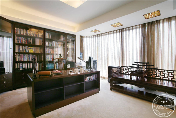 文化的交流與碰撞具有巨大的魅力,中式造型配以現(xiàn)代設(shè)計(jì)元素,整個(gè)書房的空間顯得更加豐富,大而不空,厚而不重,有格調(diào)又不顯得壓抑,使得書房環(huán)境本身就迸發(fā)出厚重的文化因子。
