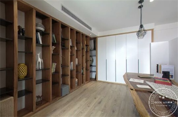 電視墻背后就是書房了,業(yè)主要求增加書房空間感,定制出高級感書房。因此,易高家居設(shè)計建議地面做一層抬高,使用原木大板做書柜,這樣女主的很多畫作和手工就可以直接擺放展示裝飾。