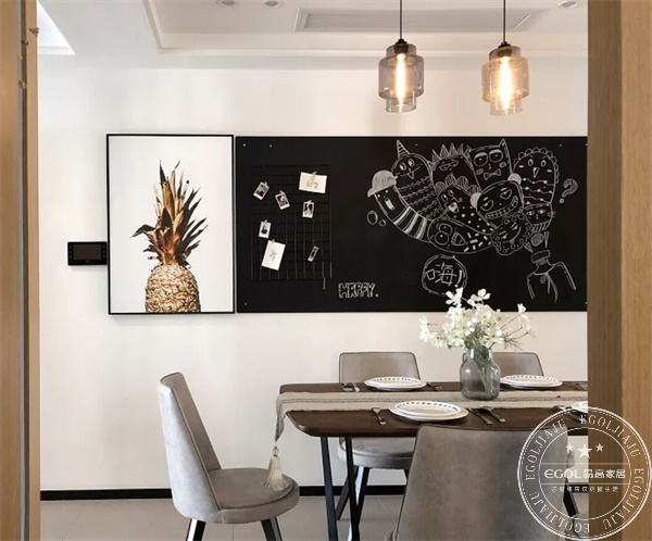 業(yè)主比較喜歡簡單、不復(fù)雜浮夸的東西;因此易高家居設(shè)計建議文藝范設(shè)計處理大白墻,定做一塊黑板,旁邊掛畫使用女主的畫作“金色菠蘿”與整體木色調(diào)完美融合。當(dāng)然,畫作是可以跟隨業(yè)主需求自由更換;“黑板報”也可以根據(jù)不同節(jié)目而自由修改。此處,家居設(shè)計師將全屋定制個性定制體現(xiàn)的淋漓盡致。