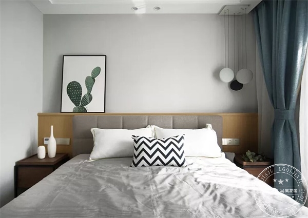 夏天陽光照射,避免感覺太熱,業(yè)主聽隨設(shè)計師意見采用藍(lán)色的窗簾降溫,其他小飾品推薦選購柜貓家居軟裝飾品,或者淘寶一些物美價廉的單品。因臥室業(yè)主不準(zhǔn)備放電視,所以設(shè)計做了一套梳妝臺和矮柜,增加儲物空間。