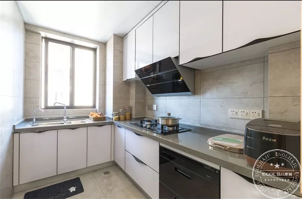 L型廚房,設(shè)計采用白色整體櫥柜,操作臺較大,可同時容納兩三人同時作業(yè)。廚房開窗,采光好、通風(fēng)性強(qiáng);在這樣干凈、明亮的廚房作業(yè),心情美美噠。