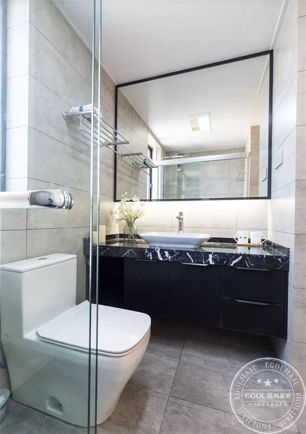因臥室已經(jīng)有了梳妝臺,所以,給業(yè)主在衛(wèi)生間設(shè)計安裝的是整面的鏡子,在視覺上營造空間變大之感。