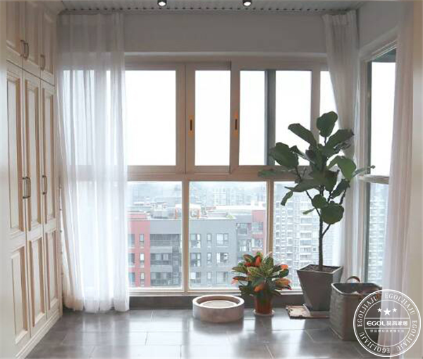 白色的窗簾保留了陽臺的透光性,將陽臺處的地面換成了地磚,種植物不用擔(dān)心沒有陽光,也不用怕滲透的水將地面損壞。左邊增加了一個儲物柜,不常用的東西可以放在里面,增加了收納功能。