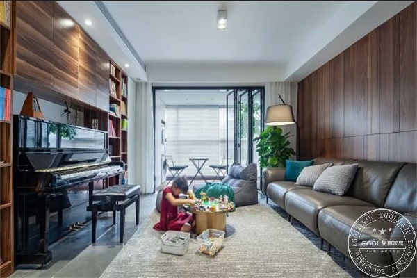 整組書(shū)柜,選擇局部開(kāi)放,局部封閉空間,來(lái)進(jìn)行收納鋼琴、小提琴、書(shū)箱等物品。書(shū)柜邊上的吊袋是原來(lái)家里帶來(lái)的,客廳并沒(méi)有采用傳統(tǒng)的茶幾,滿(mǎn)足平常放茶杯,果盤(pán),以及充當(dāng)孩子玩具的小桌幾,小茶幾便攜性,可以隨時(shí)移開(kāi),增加孩子活動(dòng)空間。朋友來(lái)訪(fǎng),盤(pán)坐著,躺在,很愜意的侃大山,放下手機(jī),看看書(shū),聊聊天異常愜意。