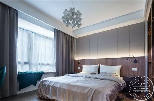 主臥床頭的設(shè)計(jì),兩邊可以調(diào)節(jié)閱讀書(shū)燈的設(shè)計(jì),床頭木飾面與硬包配上燈光會(huì)讓臥室感覺(jué)比較溫馨。