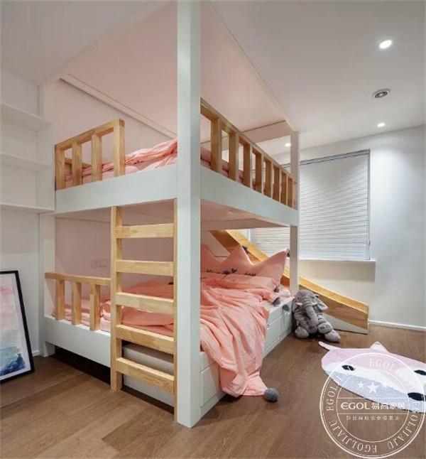 定制的兒童房,設(shè)計(jì)師的后期家具廠(chǎng)深化的,需要提前定制,應(yīng)業(yè)主要求用的全是進(jìn)口木。白色與原木色搭配,滿(mǎn)足孩子各年齡段,靠北邊滑滑梯下面可以?huà)熘烈挛?,靠南邊預(yù)留了書(shū)桌的位置。東邊墻體墨綠色黑板磁力漆,可以隨意圖畫(huà),添加磁力成分,可以吸一些卡片,以及小物件。