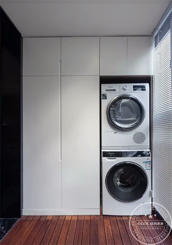 東邊收納柜收納了上下疊放的洗衣機(jī)烘干機(jī),同時(shí)隱藏了拖把池。西邊收納柜可以放置從超市買(mǎi)回生活用品,同時(shí)可以放置清潔工具等物品,簡(jiǎn)潔柜門(mén)設(shè)計(jì),配上防腐木,放置休閑座椅,優(yōu)化陽(yáng)臺(tái)的休閑與實(shí)用。