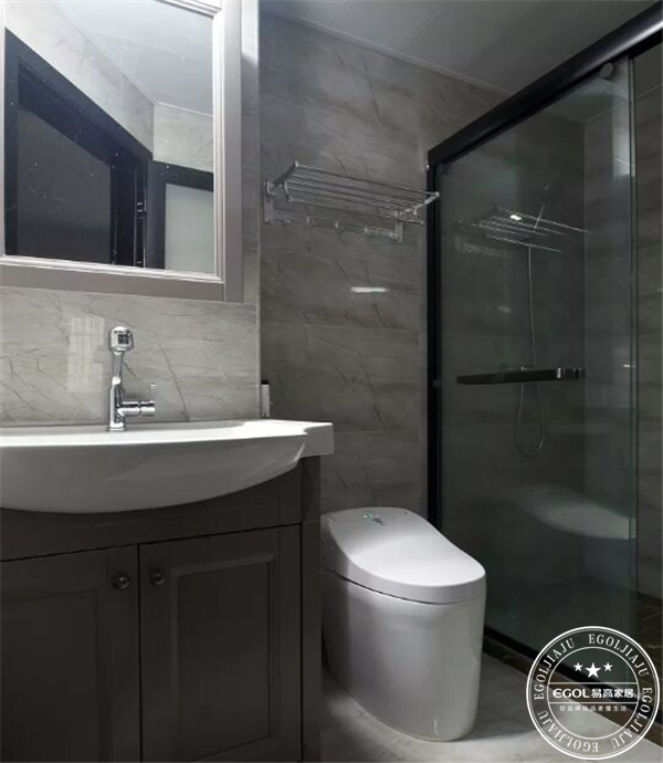 洗手間的馬桶用智能的,洗手臺(tái)采用的是鏡柜設(shè)計(jì),再也不要擔(dān)心無處安放的化妝品,納鞋底瓶瓶罐罐了。