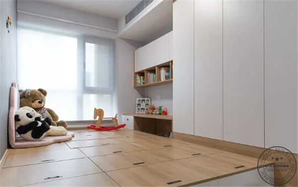 開放式設(shè)計(jì),打破常規(guī)過道的狹長視覺效果。一面墻采用黑板漆飾面,增加書桌為學(xué)習(xí)區(qū)域。榻榻米組合柜為小朋友玩具的儲物柜,學(xué)習(xí)、活動、儲物等功能齊全。