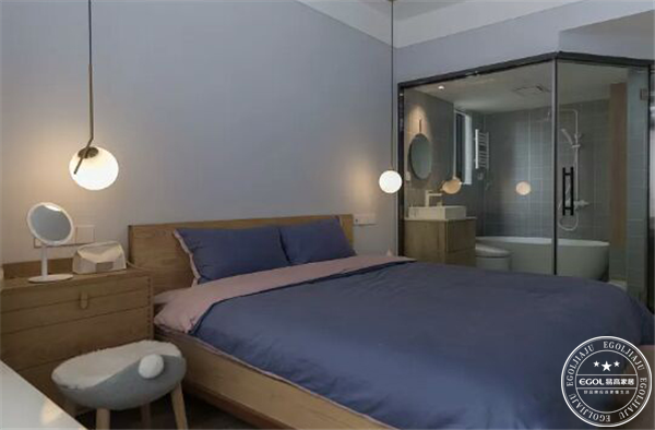 原木色加白色整面衣柜。主臥光線不是很明亮,選擇淺色色調(diào)和全透明玻璃衛(wèi)生間,延展主臥視覺。主衛(wèi)設(shè)計(jì)為側(cè)開門,增加主臥進(jìn)門空間和整體活動空間。使空間靈動不刻板。