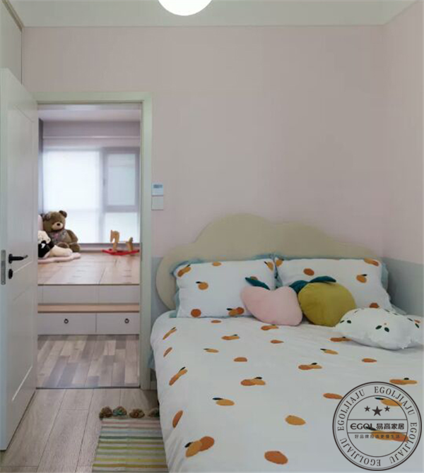 兒童房,墻面乳膠漆粉色與淺灰拼接。云朵床,云朵靠背三色屋主都給小公主備齊。