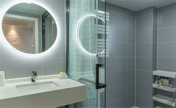 客衛(wèi)空間不夠,采用玻璃隔斷作為干濕分區(qū)隔斷。灰色格子磚配上幾何圖形花磚;幾何藝術(shù)感極強(qiáng)。