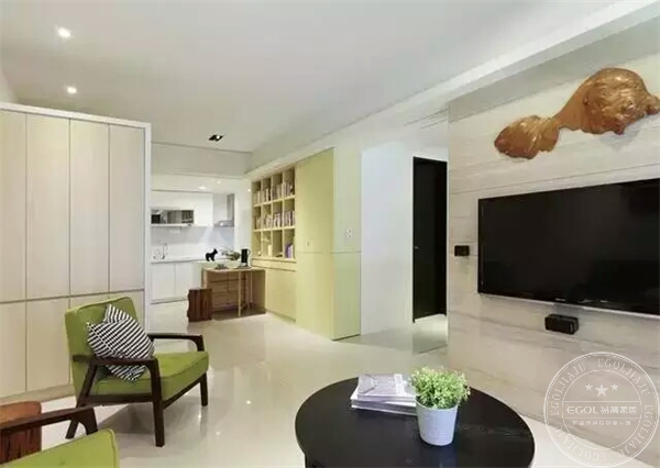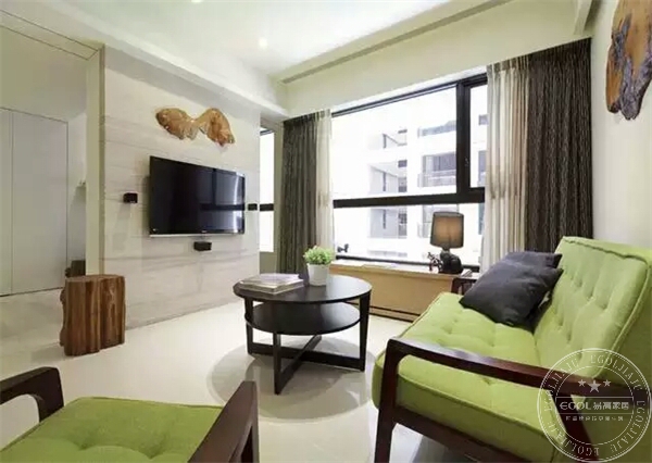 客廳的搭配以淺色系為主,茶幾和沙發(fā)是配套的,裝飾的空間色彩相對來說不是很壓抑,簡單的淡綠色能夠緩解視覺上的疲勞。