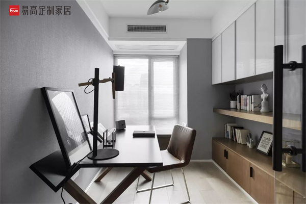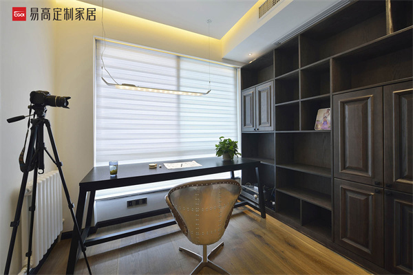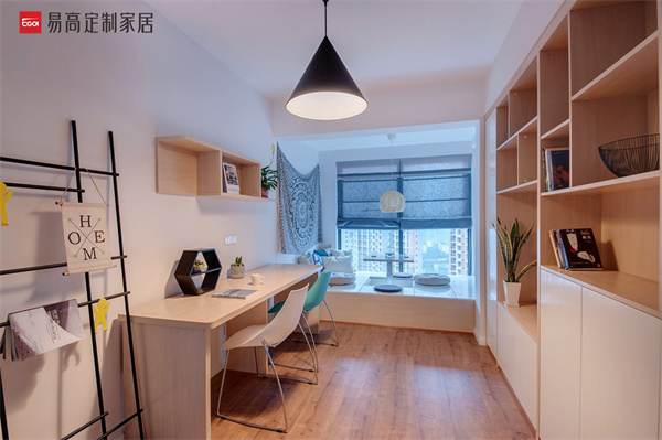 日常生活中比較常見的就是對稱的定制書柜,柜體的本身或者書桌作為中軸線,打造對稱設計的柜體,這種設計比較簡單,適合大多數(shù)的人群,而且在小空間里也非常適合,可以提高空間的利用率。