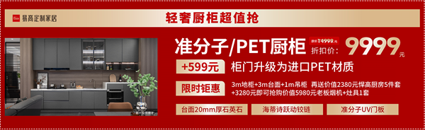 有喜愛輕奢風(fēng)格的業(yè)主看過來!活動(dòng)期間僅需9999元就能帶走價(jià)值14999元的準(zhǔn)分子廚柜,+599元更可升級(jí)進(jìn)口PET門板,再送價(jià)值2380元悍高廚房5件套。海蒂詩躍動(dòng)鉸鏈、準(zhǔn)分子UV門板為細(xì)節(jié)加分,不止顏值派,更是實(shí)力派!