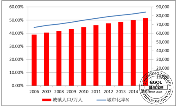 現全屋定制是整個家具市場的看點,在此之前,定制家具行業(yè)將會不斷擴充定制品類,廠家不斷招商,市場不斷轉型是未來主要的發(fā)展趨勢,據統(tǒng)計,國內定制家具行業(yè)滲透率只有20%,未來發(fā)展空間巨大,穩(wěn)步提升是近年發(fā)展景象,未來可能因條件改變不斷刺激行業(yè)發(fā)展,據國務院發(fā)布規(guī)劃條例中,2020年我國城鎮(zhèn)化建設將達到60%,對于家居行業(yè)是不是個好消息呢?