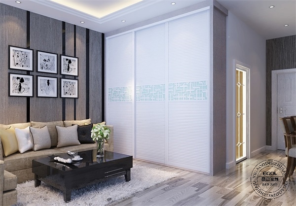 進門處左側為餐廳區(qū)域,右側為廚房區(qū)域。廚房由于油煙問題,采用嵌入式衣柜假墻,將用餐區(qū)域與生活區(qū)域分開,又大大增加了儲物空間。墻體厚度也足夠放入日常生活衣物與被褥等等,衣柜移門不浪費空間且十分美觀。