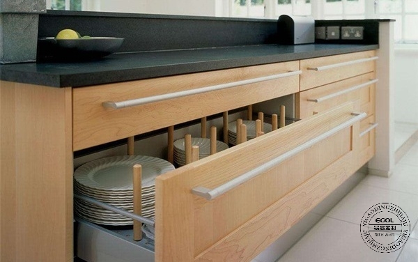 廚柜最好做成抽屜 推拉式這樣方便取放,視覺也較好。而吊柜一般做成30到40cm寬的多層格子,柜門做成對(duì)開,或者折疊拉門形式。