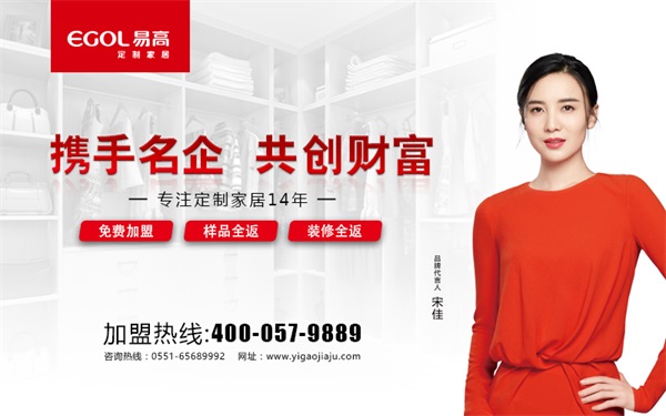 我們首先了解下易高品牌底蘊。易高定制家居(EGOL全屋定制)始于2004年,是集研發(fā)、設(shè)計、生產(chǎn)、銷售、服務(wù)于一體的全屋定制家具加盟品牌,產(chǎn)品覆蓋了從臥室到書房、從餐廳到客廳等多個空間,以實木、板木、模壓、板式等系列為主。2015年簽約影后宋佳代言,全面提升品牌形象。