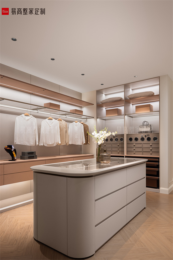 設(shè)計師巧妙運用直線和曲線的交匯,創(chuàng)造出剛?cè)岵拇髿饷栏小i_放式衣帽間系統(tǒng)和升降梳妝臺藏露有序,將空間層次層層推進。流動的步履中,舉手投足間都縈繞著奢雅、隨性的氣息,舒享品質(zhì)人居。