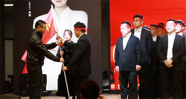戰(zhàn)鼓催征,易高家居董事長孔慶松為全體戰(zhàn)士親授戰(zhàn)旗,現(xiàn)場士氣高漲。臨行前,易高鐵軍喝下壯行酒,并以鏗鏘有力的誓詞宣告對任務目標的完美執(zhí)行,彰顯出使命必達的決心!